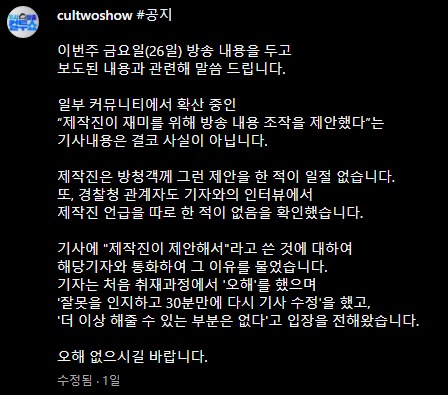 28일 두시 탈출 컬투쇼 제작진은 인스타그램에 '26일 방송 내용을 두고 보도된 내용과 관련해 말씀드린다'며 글을 올렸습니다. 제작진은 일부 커뮤니티에서 확산 중인 ‘제작진이 재미를 위해 방송 내용 조작을 제안했다는 기사내용은 결코 사실이 아니다. 제작진은 방청객께 그런 제안을 한 적이 일절 없다.' 라고 말했습니다. 이어 '경찰청 관계자도 기자와의 인터뷰에서 제작진 언급을 따로 한 적이 없음을 확인했다. 기사에 '제작진이 제안해서’라고 쓴 것에 대하여 해당기자와 통화하여 그 이유를 물었다. 기자는 처음 취재과정에서 오해를 했으며 잘못을 인지하고 30분 만에 다시 기사 수정을 했고, 더 이상 해줄 수 있는 부분은 없다고 입장을 전해왔다.' 라고 전했습니다.